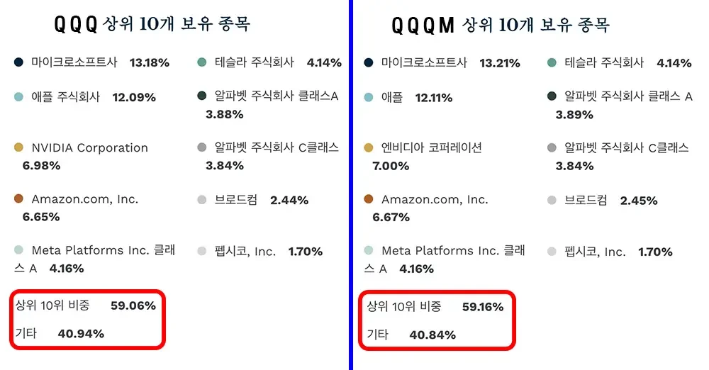 QQQ와 QQQM의 보유 종목을 비교하면, 두 ETF는 상당히 유사합니다. 두 ETF의 상위 10개 보유 종목을 보면, 다음과 같은 결과를 보입니다.